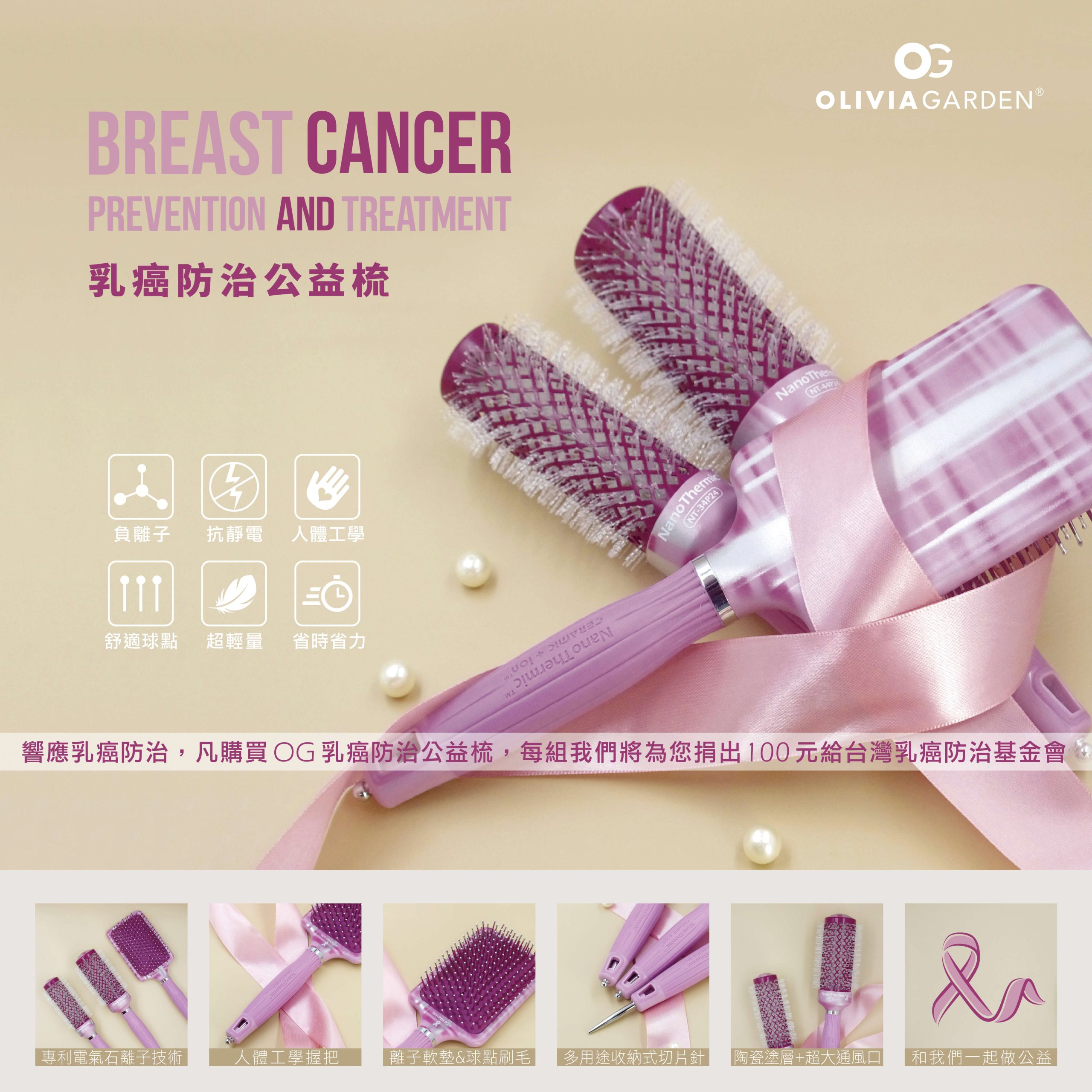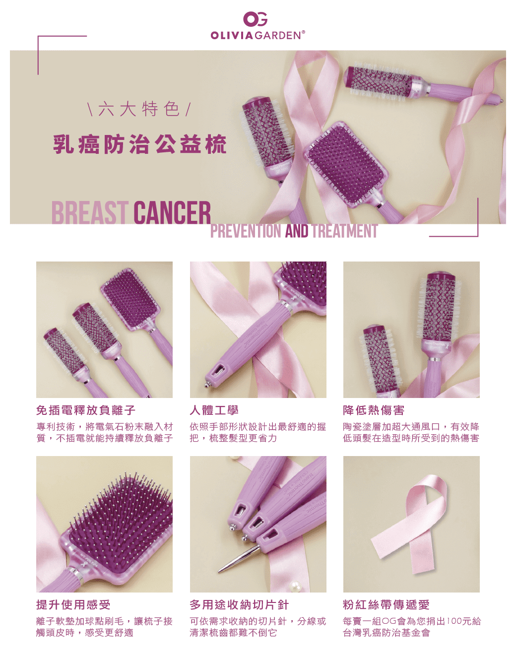 每購買一組【Olivia Garden】乳癌防治公益梳,將捐出100元給台灣乳癌防治基金會,為抗癌女性提供支持。
