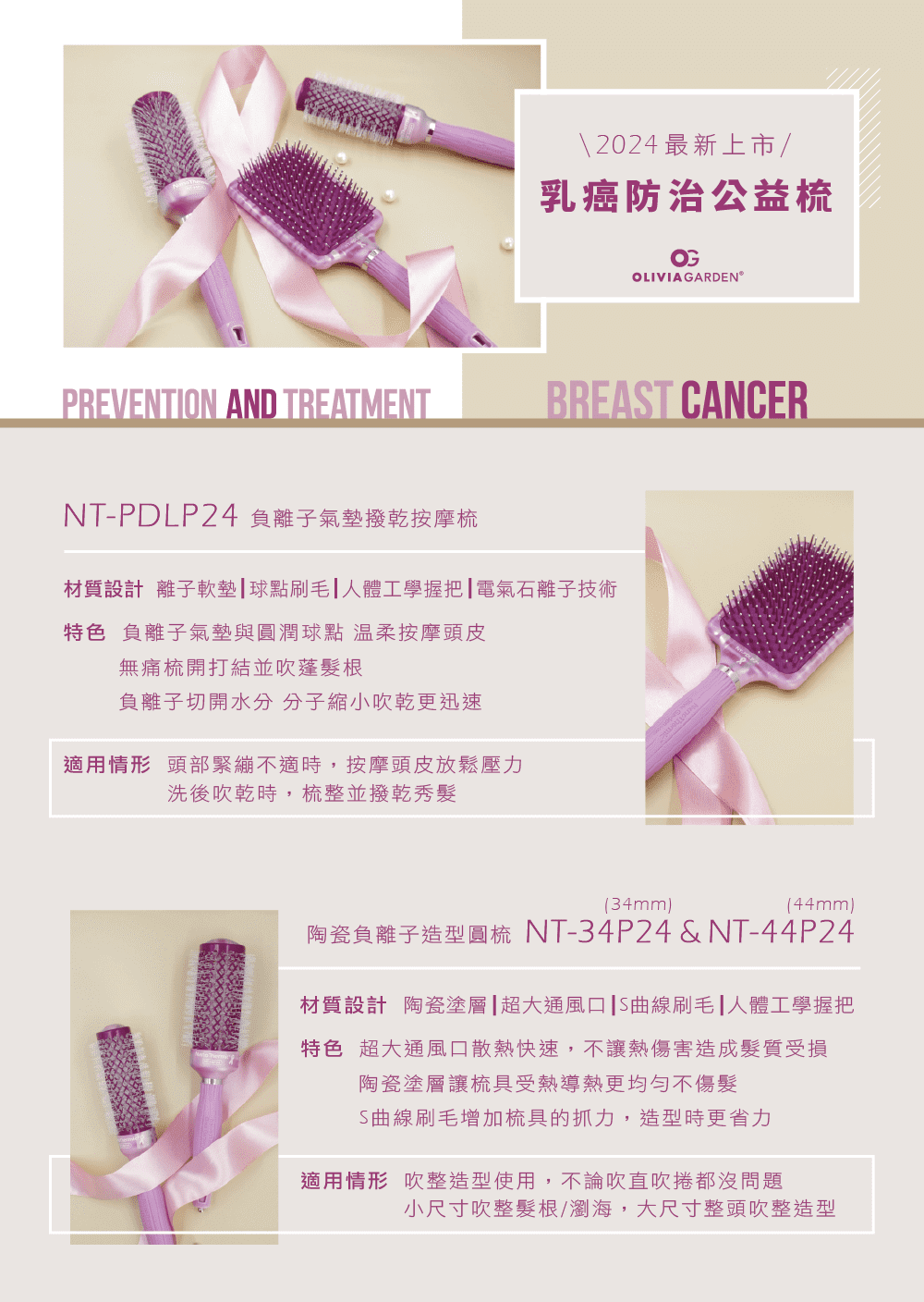 【Olivia Garden】2024乳癌公益梳是為響應乳癌防治推出的限量版公益梳組,每購買一組,Olivia Garden將捐出100元給台灣乳癌防治基金會,幫助乳癌患者度過艱難的抗癌之路。Olivia Garden自成立50餘年來,一直致力於設計適合各種髮質的專業造型工具,關心每位女性的健康與美麗。此次推出的公益梳組,包含三款高效造型工具,結合負離子技術與陶瓷設計,提供柔順、健康的造型效果。