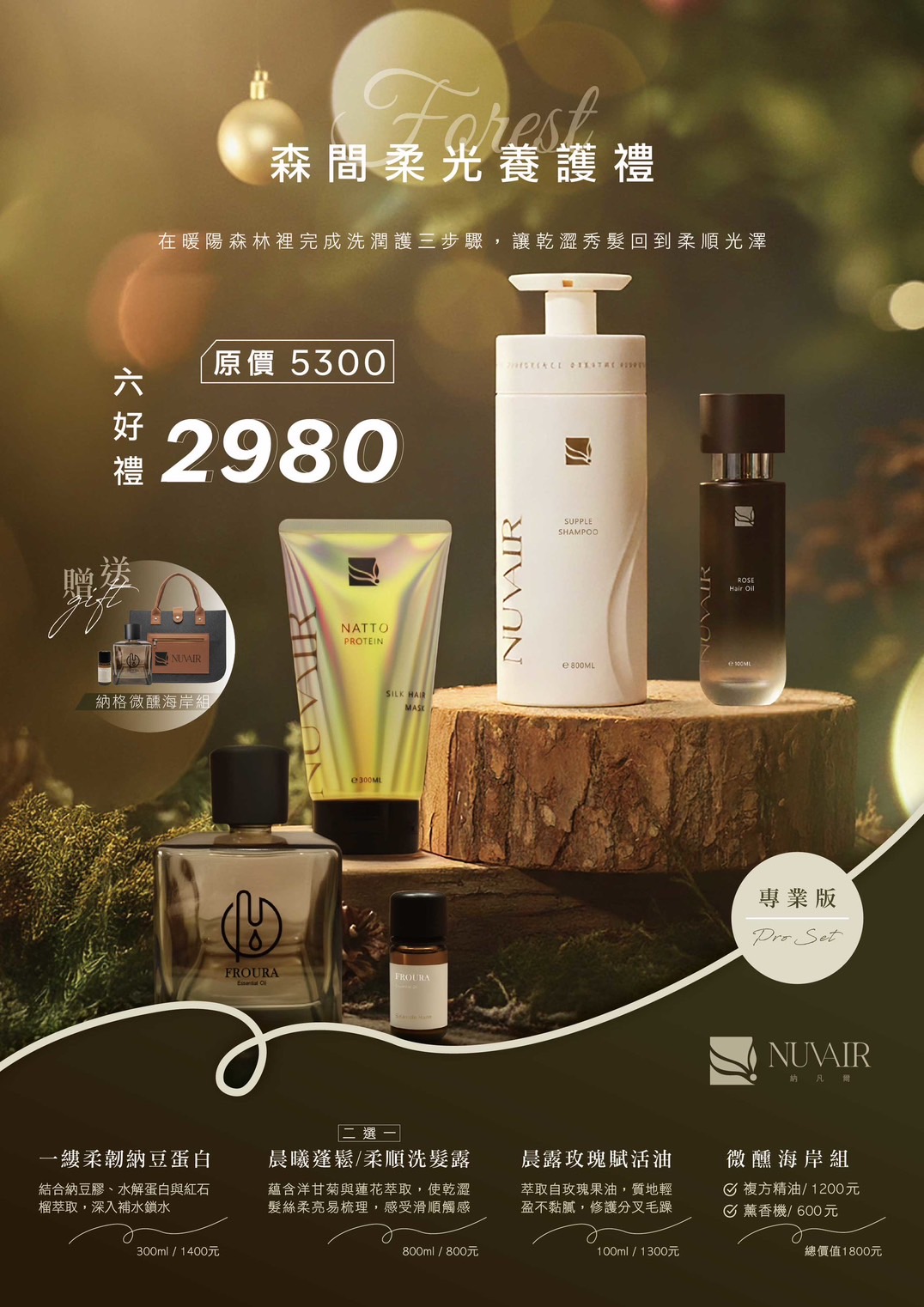 【森間柔光養護禮】精選 NUVAIR 三款高效養護單品,從清潔、補水到修護鎖養,一次完成完整髮絲養護流程,特別為乾澀、毛躁、缺乏光澤的髮質設計。