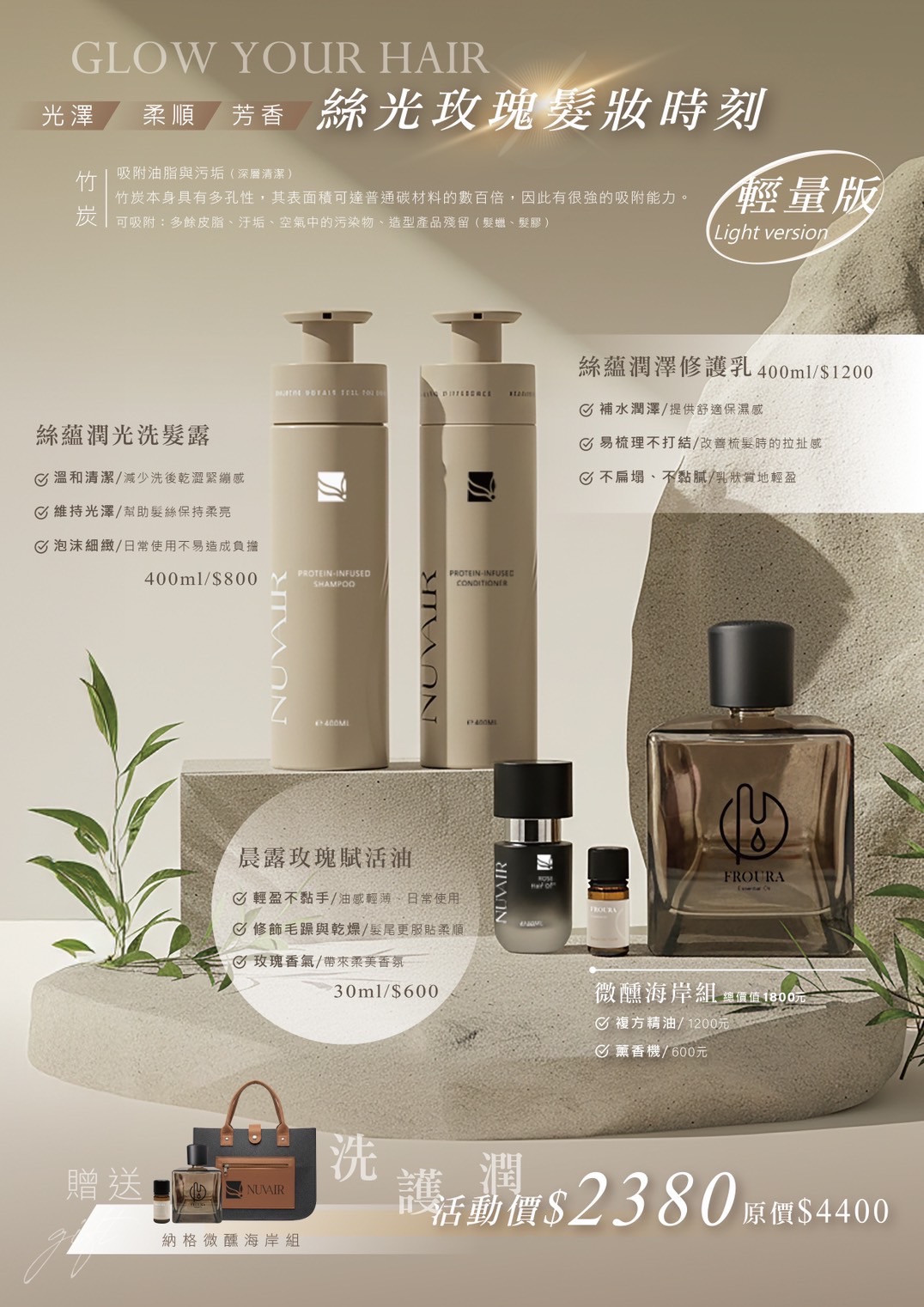 讓秀髮沈浸在晨露玫瑰的優雅香氣中,透過自然植萃力量,打造如絲綢般的柔順光澤。本系列特別推出**「輕量版 (Light Version)」**,質地更輕盈、無負擔,適合追求蓬鬆感與細緻修護的您。