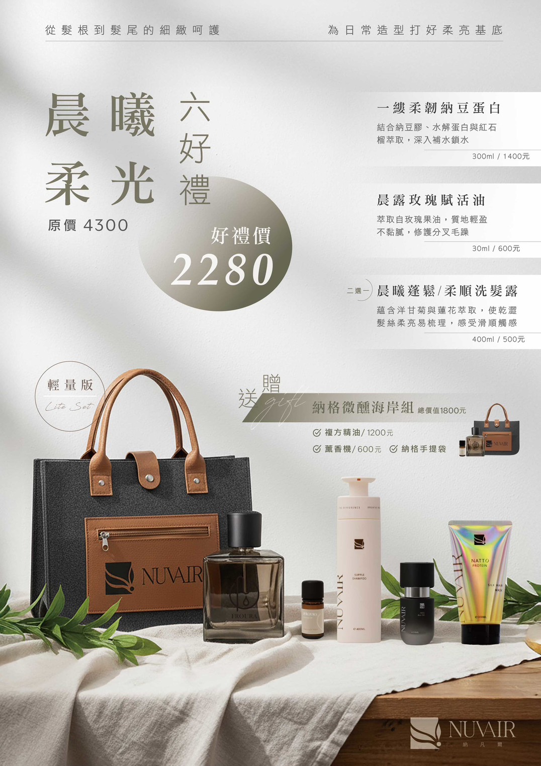 【晨曦柔光養髮禮|輕量版】精選「洗 × 護 × 養」三步驟,專為日常保養、送禮入門與輕保養族群設計,讓頭髮回到柔順、輕盈、有光感的理想狀態。