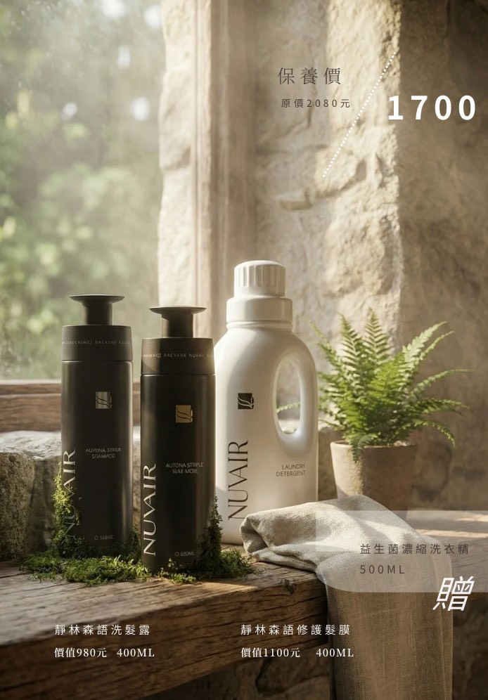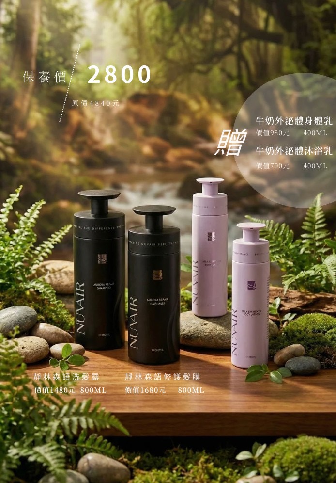 NUVAIR 靜林森語修護髮膜,融合羽衣甘藍蛋白、巴西莓果、有機雪絨花等植萃成分,能深入修護乾燥與受損髮絲,同時舒緩頭皮壓力,洗後彷彿漫步森林氣息中,帶來穩定溫柔的保養體驗。